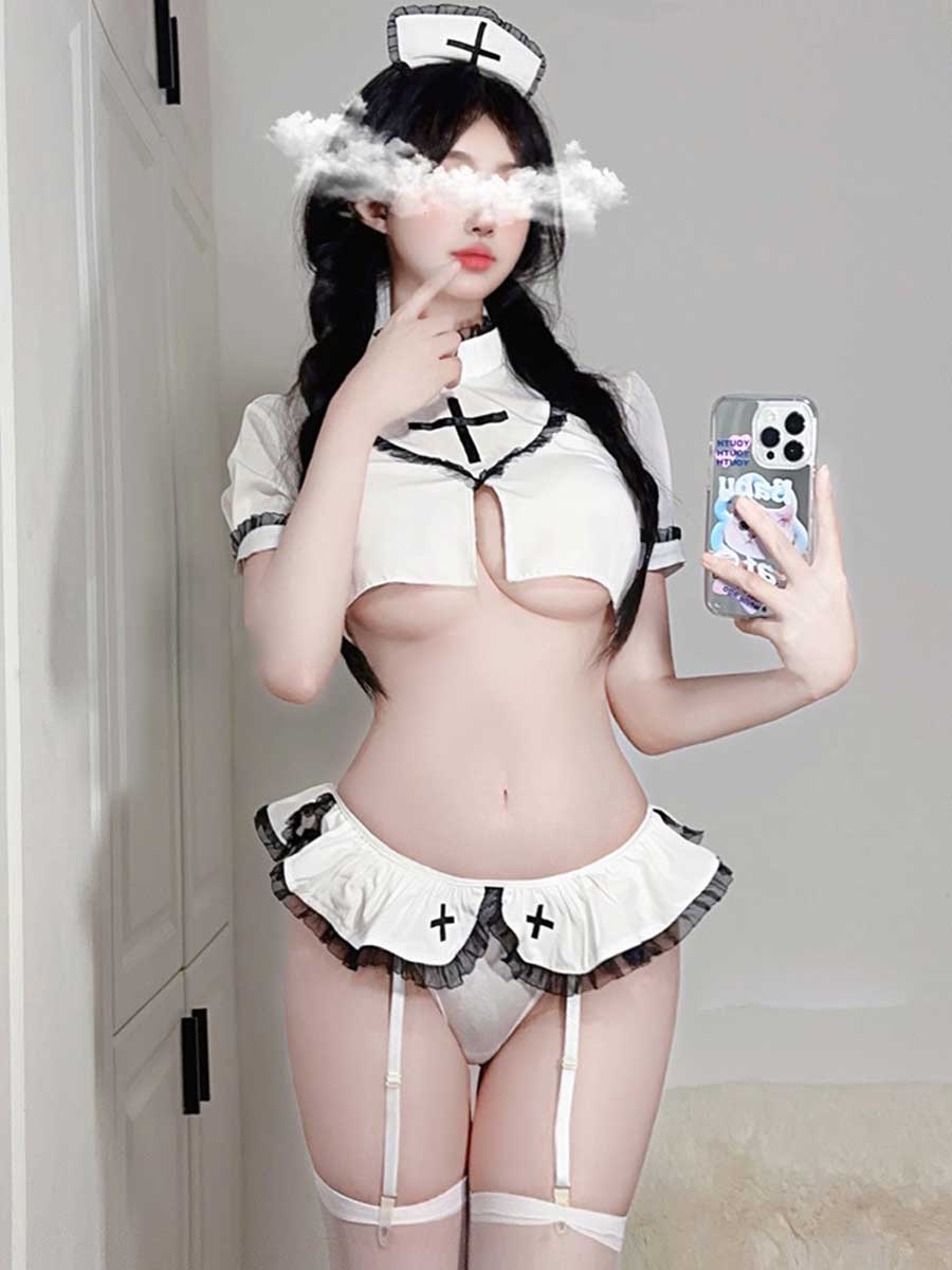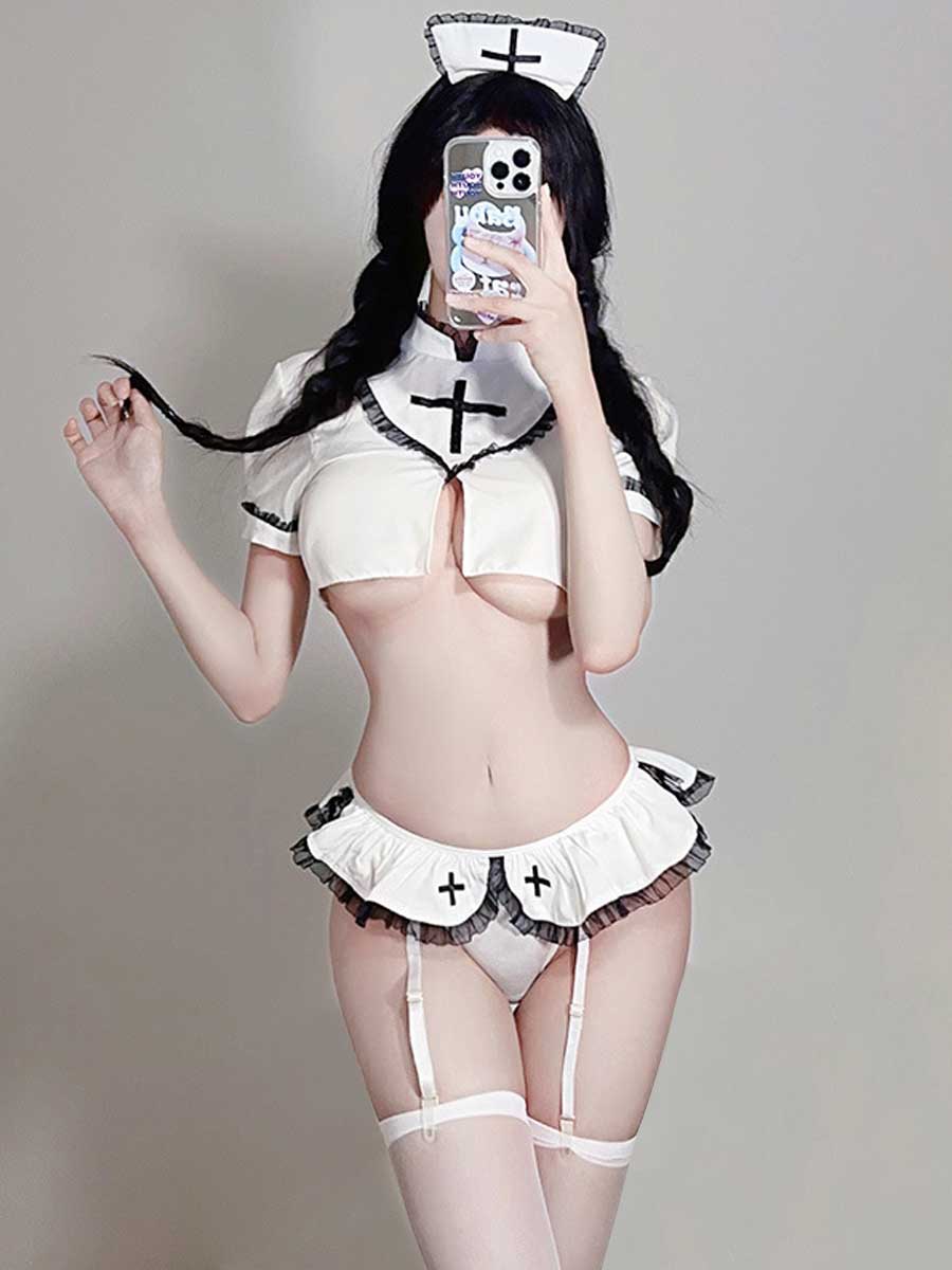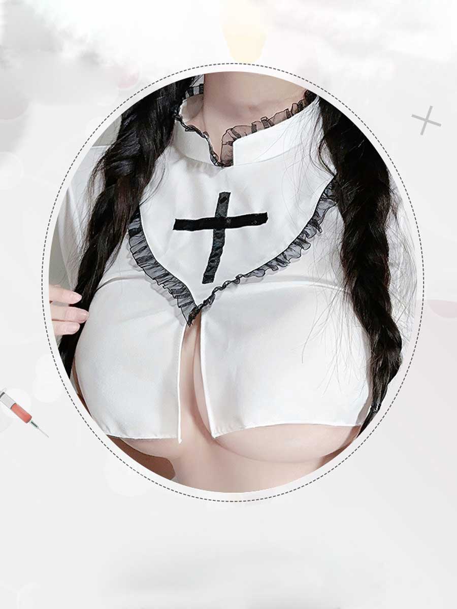 Design: Nurse Cosplay Lingerie featuring a white crop top with a black mesh trim, a hospital cross detail, short puff sleeve, back lace-up closure, and a matching panty with ruffled trim, looks a little big cool and a little fashion.