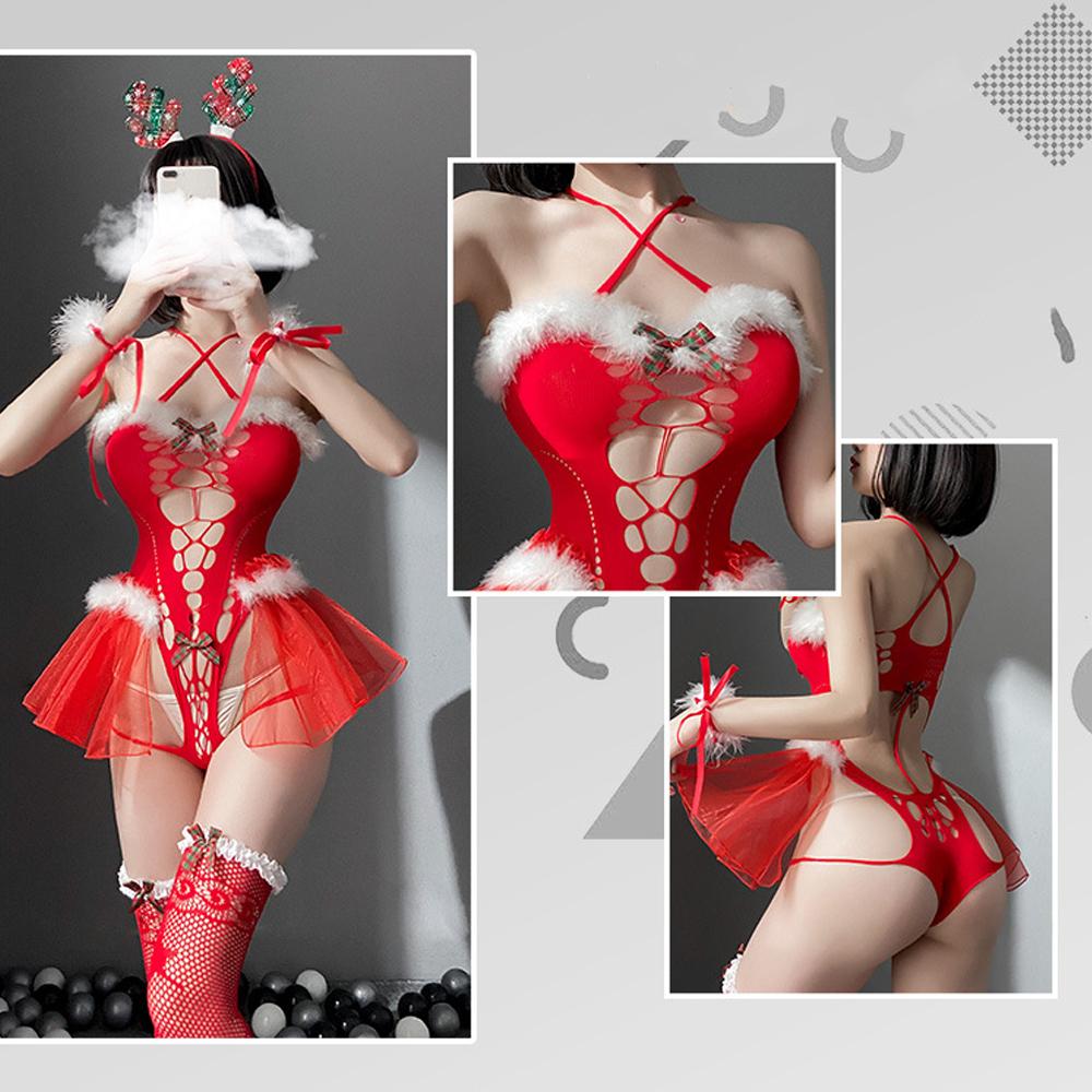 Sexy Reindeer Outfit Santa Bodysuit Mrs Claus Lingerie Hollow Velvet Christmas Cosplay Costume