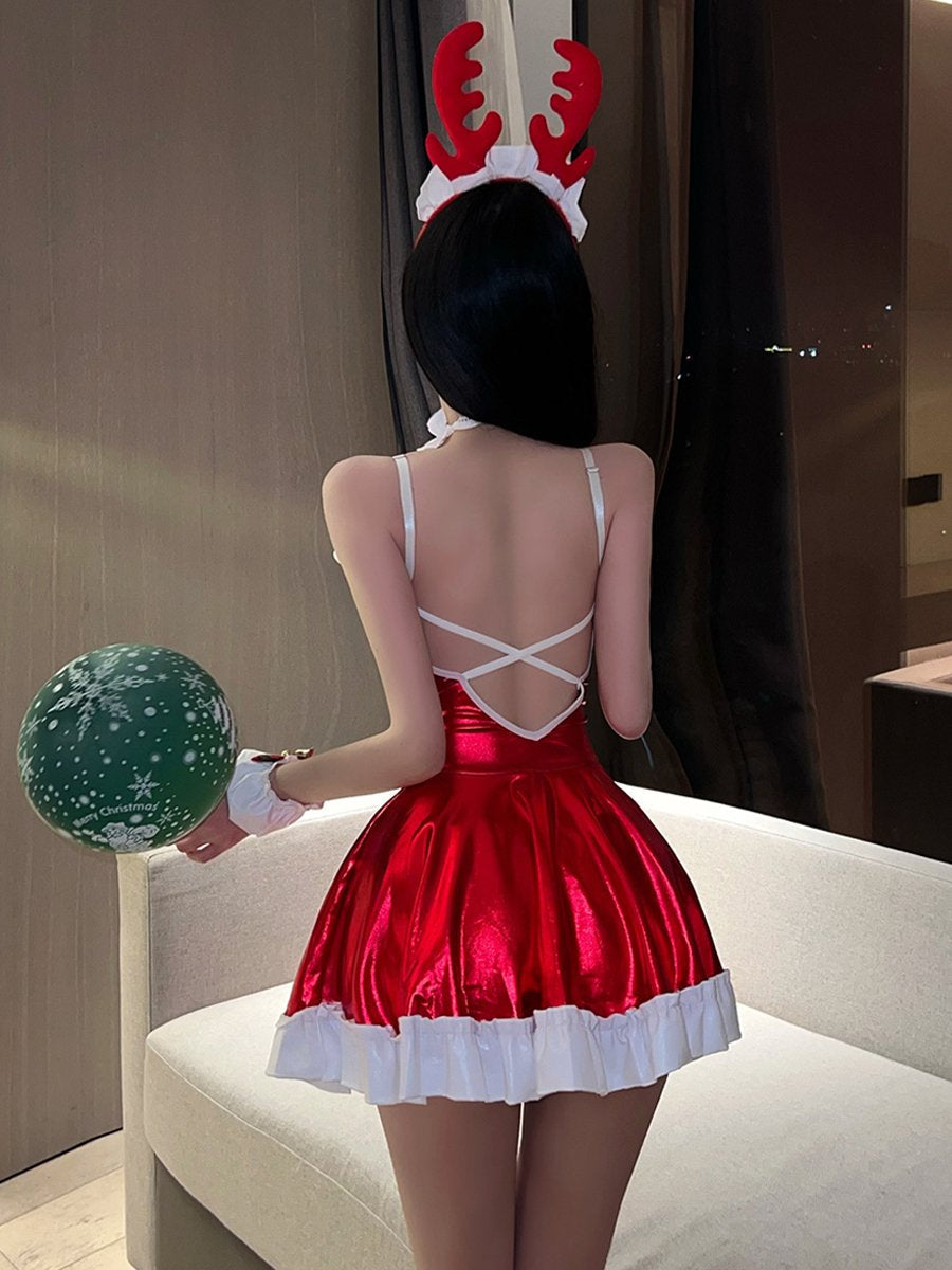 Design: This Santa Claus Costume featuring a red metallic mini dress with white ruffled trim, adjustable spaghetti straps, and A-line hem with a white trim gives the dress a festive and flirty look. Spread some holiday cheer in style!