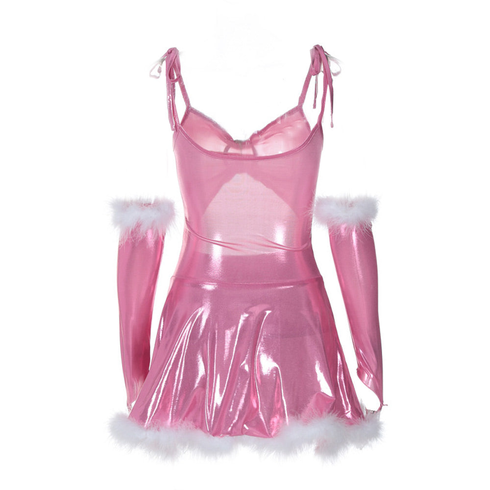 Design: This Sexy Santa Clause Lingerie Set features a metallic mini dress, spaghetti shoulder straps, a front dimante buckle detail and keyhole, and a floofy mini skirt with white marabou trim.