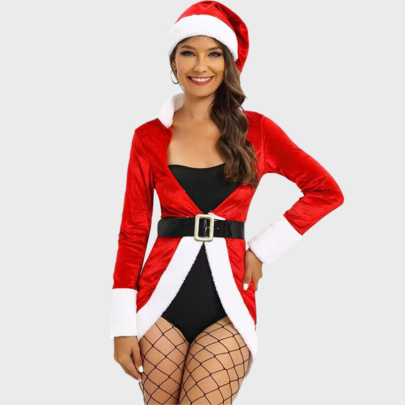 Sexy Santa Costume Women's Christmas Outfit Red Velvet Xmas Coat with Bodysuit and Hat
