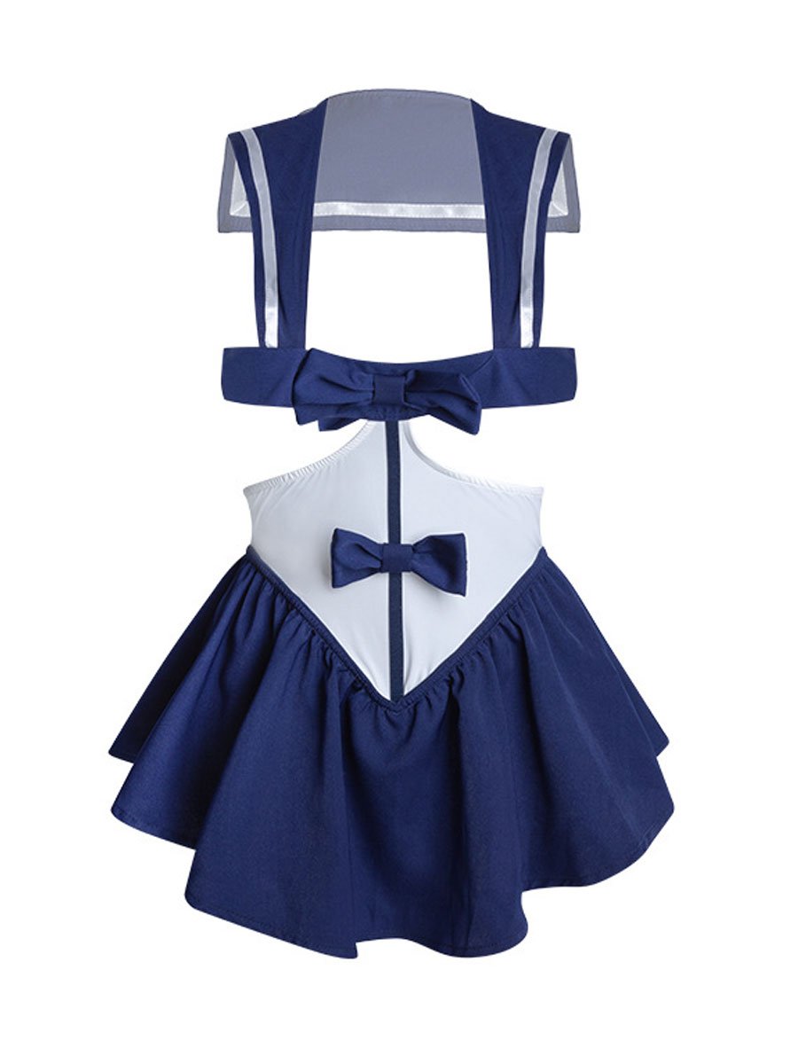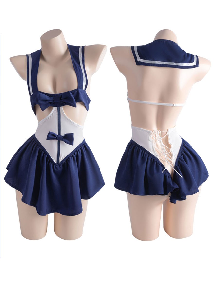 Design: This sexy sailor style costume featuring a white and navy blue dress, a bigger sailor neckline, a front dark blue bow accents, open back with lace-up closure, for a great cosplay costume look.