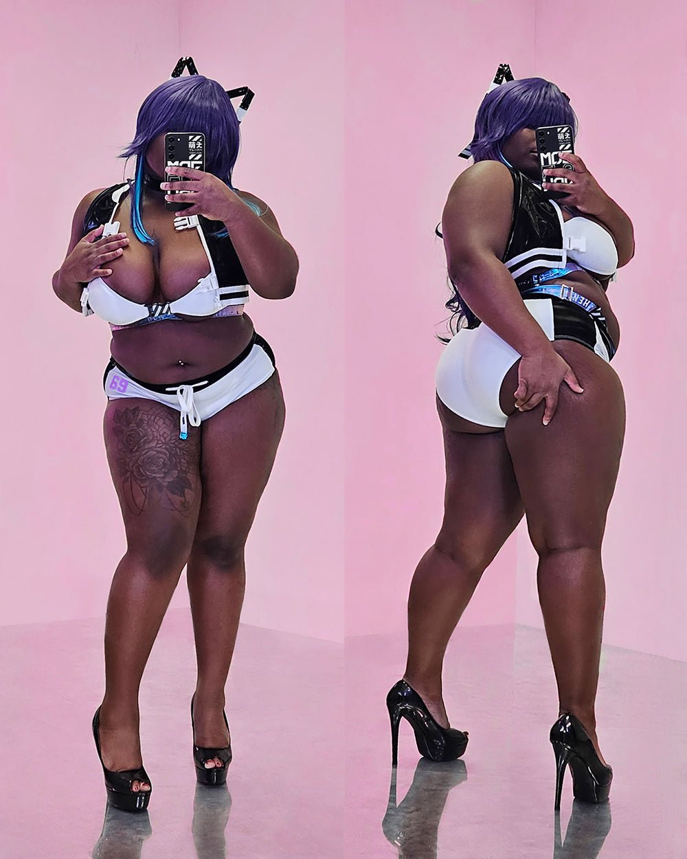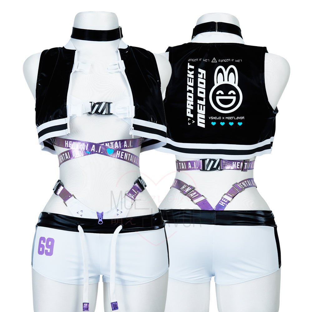 Elevate your swimwear game with the Projekt Melody Hentai A.I. Swimsuit, drawing inspiration from Projekt Melody's renowned past model. This mini bandeau swimsuit features adjustable purple straps with printed text for a sleek, customizable look. The bottoms include a zipper and eye-catching futuristic prints. The jacket, made from buttery smooth vinyl fabric, features a distinctive back print and white buckles on the front. Paired with mini shorts that have a convenient drawstring, this ensemble is the perfect swimsuit coverup. Dive into the future of fashion with this innovative and stylish set.