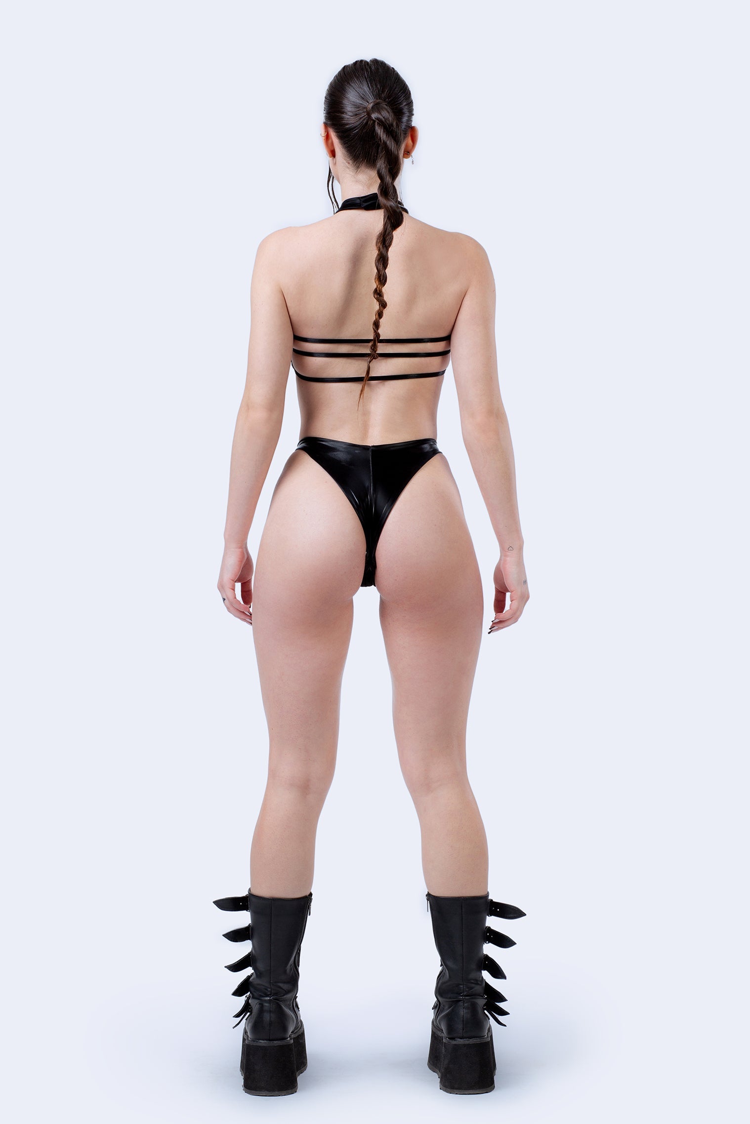 A dash of otherworldly style with a high contrast of glossy black on bare skin. The strappy construction leaves just enough the imagination while elongating your figure and showing off your best assets.