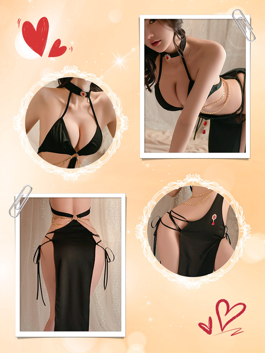 Design: This Sultry Neko Cat Outfit featuring a black dress with a choker neckline, golden chains accents, side lace-up closure, and a breezy skirt with front and back panels. With the cut-out bodice and draping chain accents, you can make a bold statement.