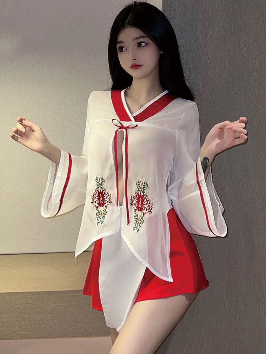 Design: The red mini skirt and white kimono has been traditional for the Shrine Maiden. White kimono top features embroidery red floral detailing, red bow accents, long flared sleeve, all-over sheer mesh is tantalizing to your partner. Mini skirt featuring attached white front and back panels will make you sexy, cute and attractive.
