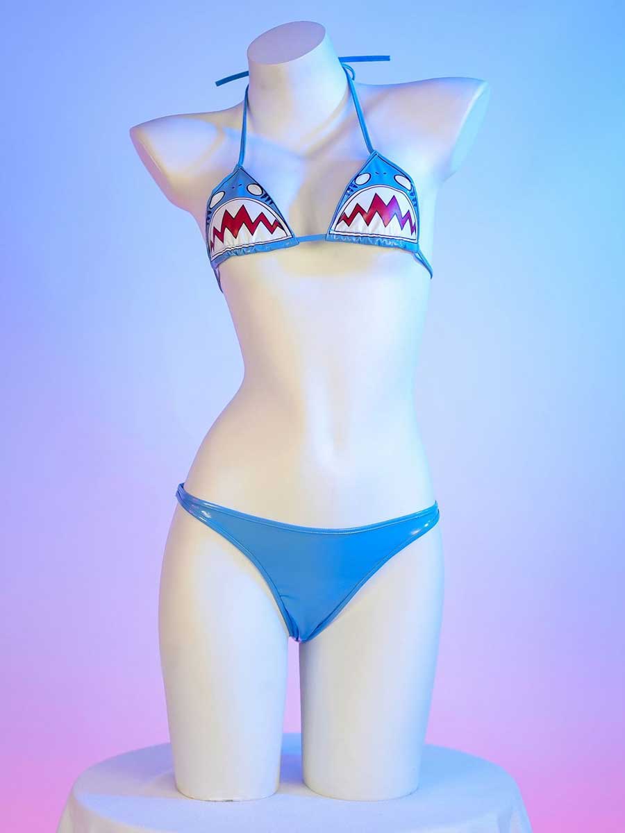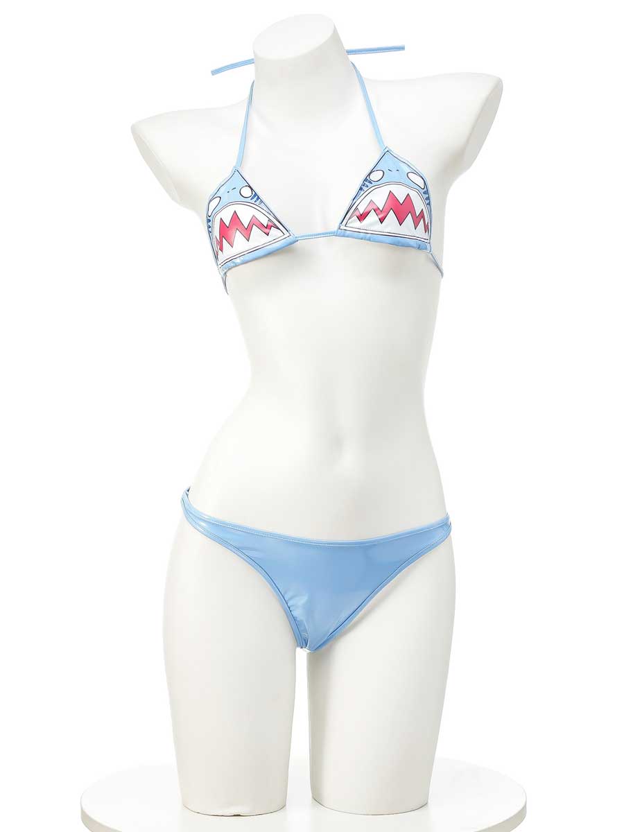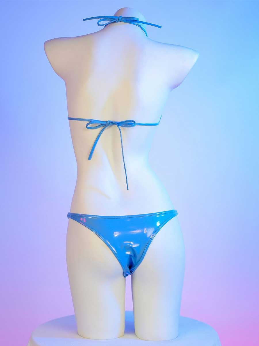 Design: Yomorio anime cosplay lingerie featuring a micro bikini top with slim triangle cups, halter straps, a tie back closure, and a matching bottoms with a thong cut back.