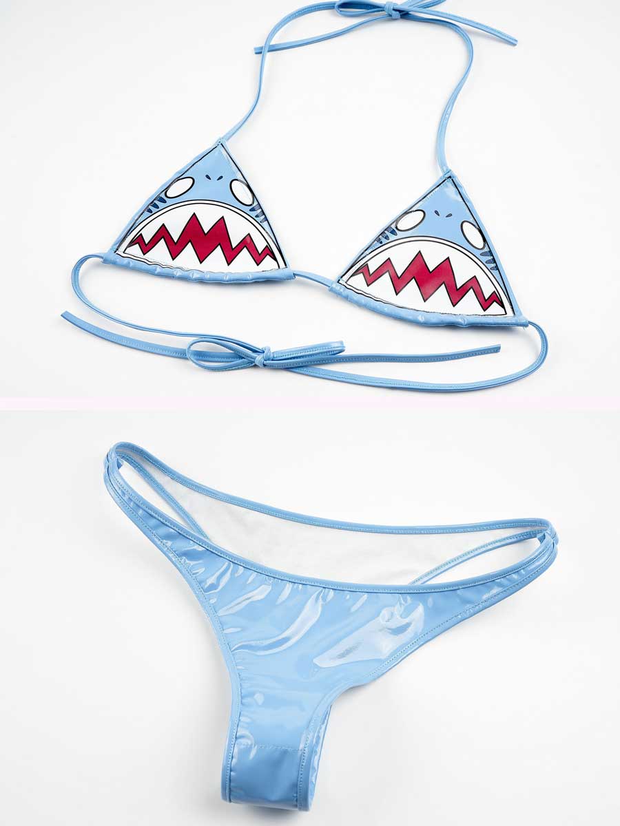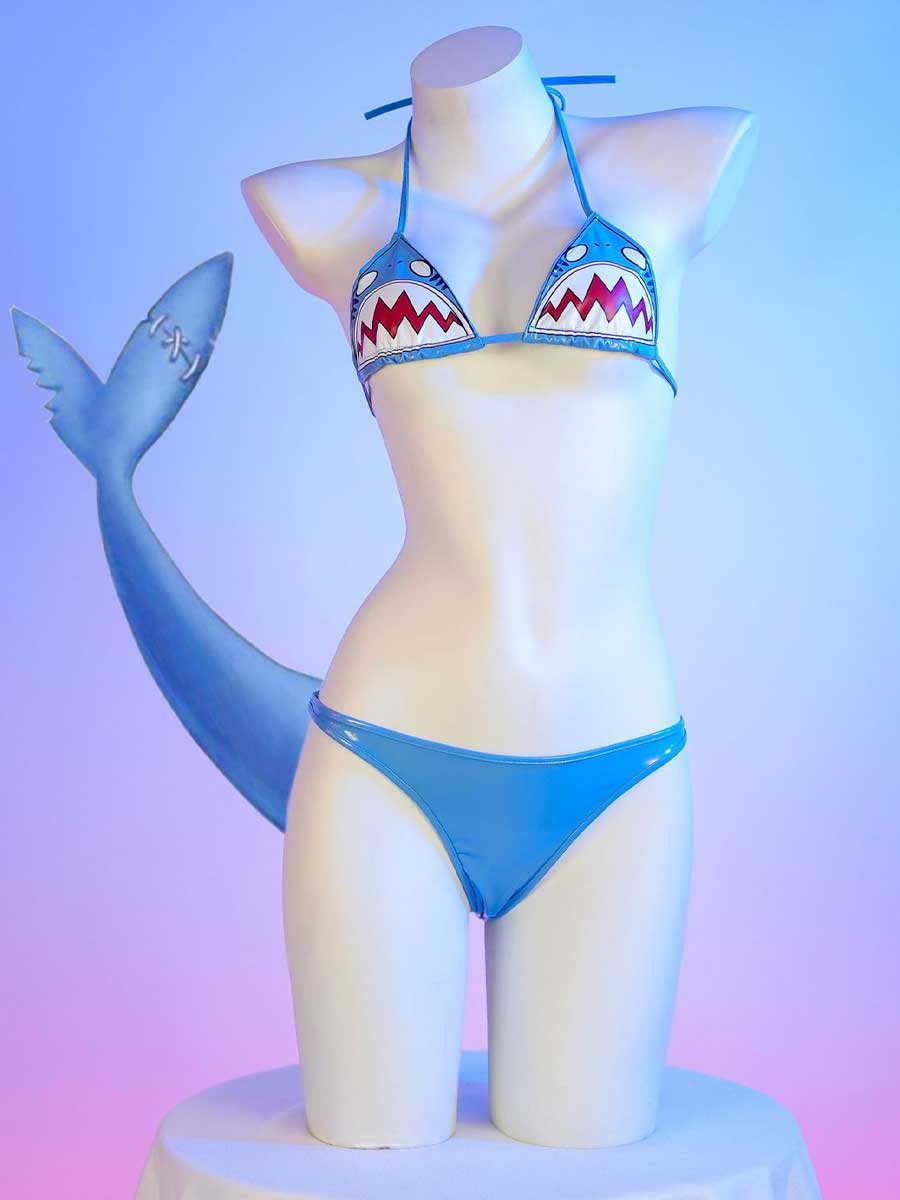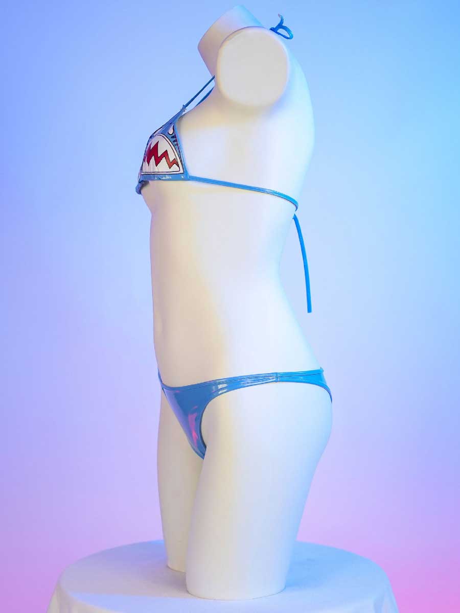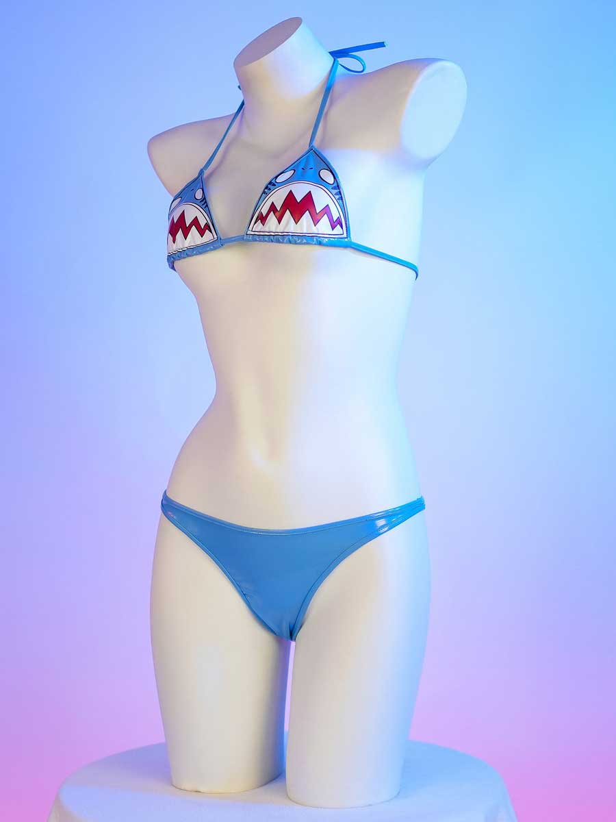 Design: Yomorio anime cosplay lingerie featuring a micro bikini top with slim triangle cups, halter straps, a tie back closure, and a matching bottoms with a thong cut back.