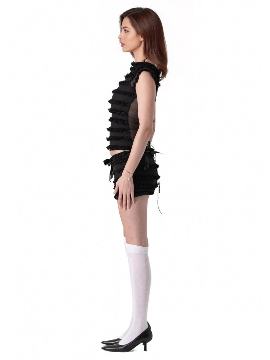Design: Sexy Night Club Outfit Set featuring short-sleeve top, allover ruching and fluttery frills, an open back with crisscross lace-up detailing, The matching ruffle-trimmed shorts sit low on the waist and are finished with dainty satin bows for an extra touch of charm.
