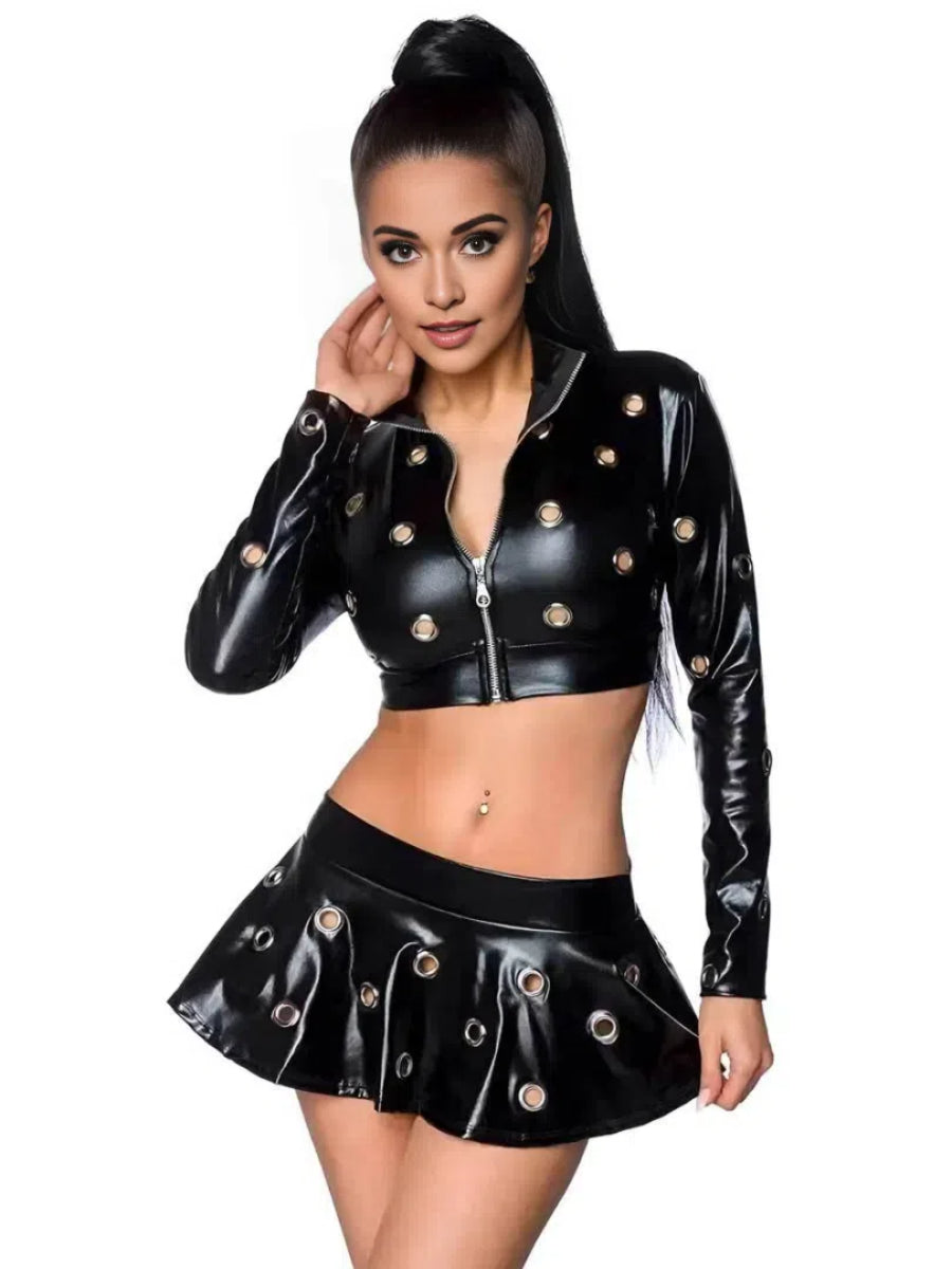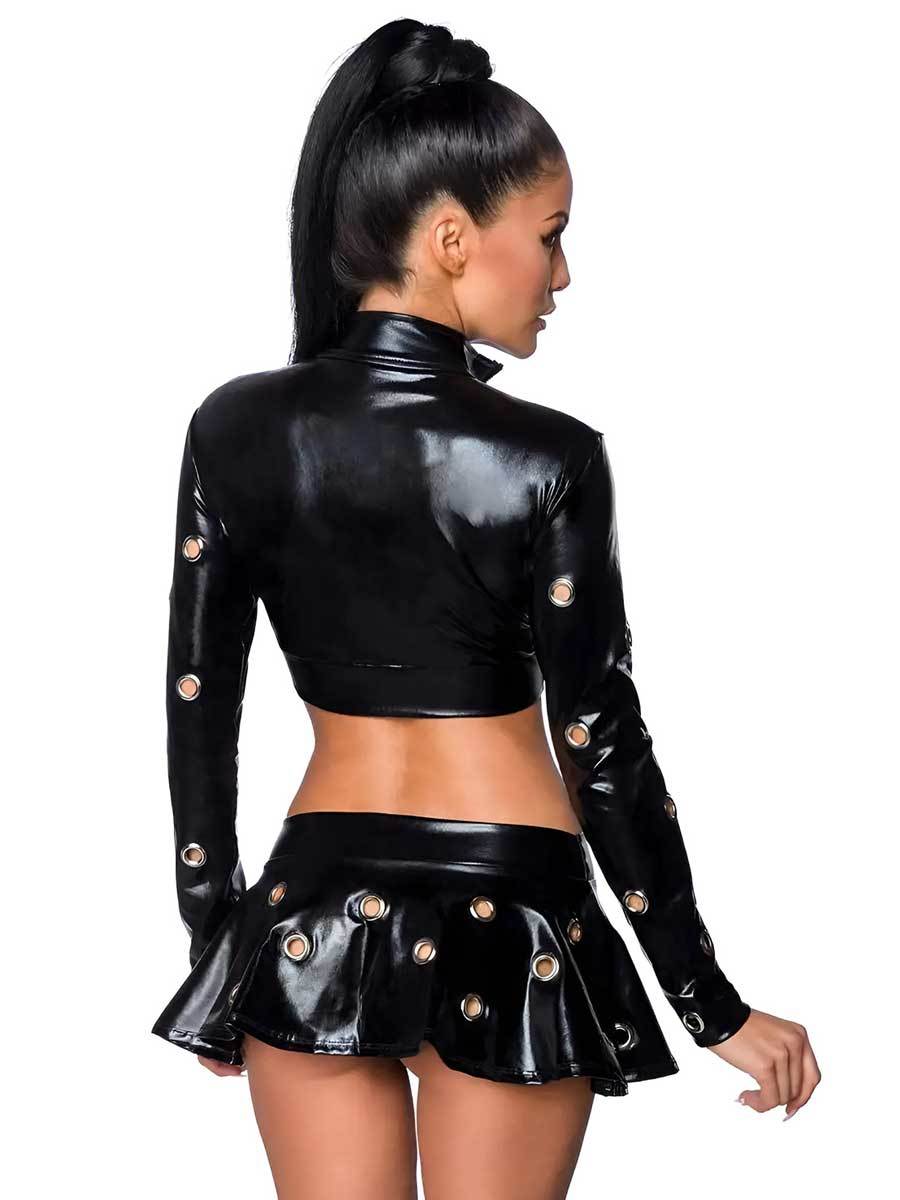 Design: This wet look nightclub costume featuring a long sleeve crop top with a zip up front, an allover silver grommet accents, and matching mini skrit, and T thong. Prepare to stand out and make a statement with this striking outfit.