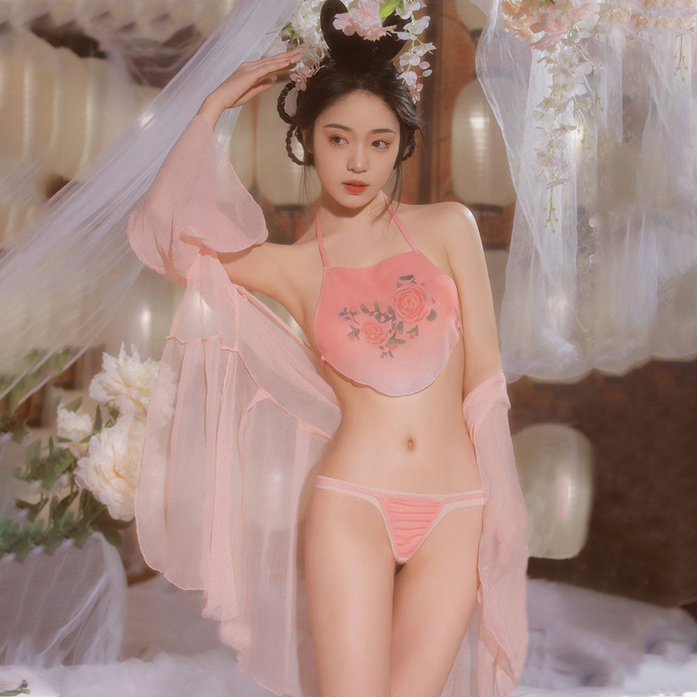 Design: This vintage chinese costume featuring sheer chiffon robe with long kimono sleeve, a strapless top with a tie back closure, floral front printed, and a matching sexy panty.