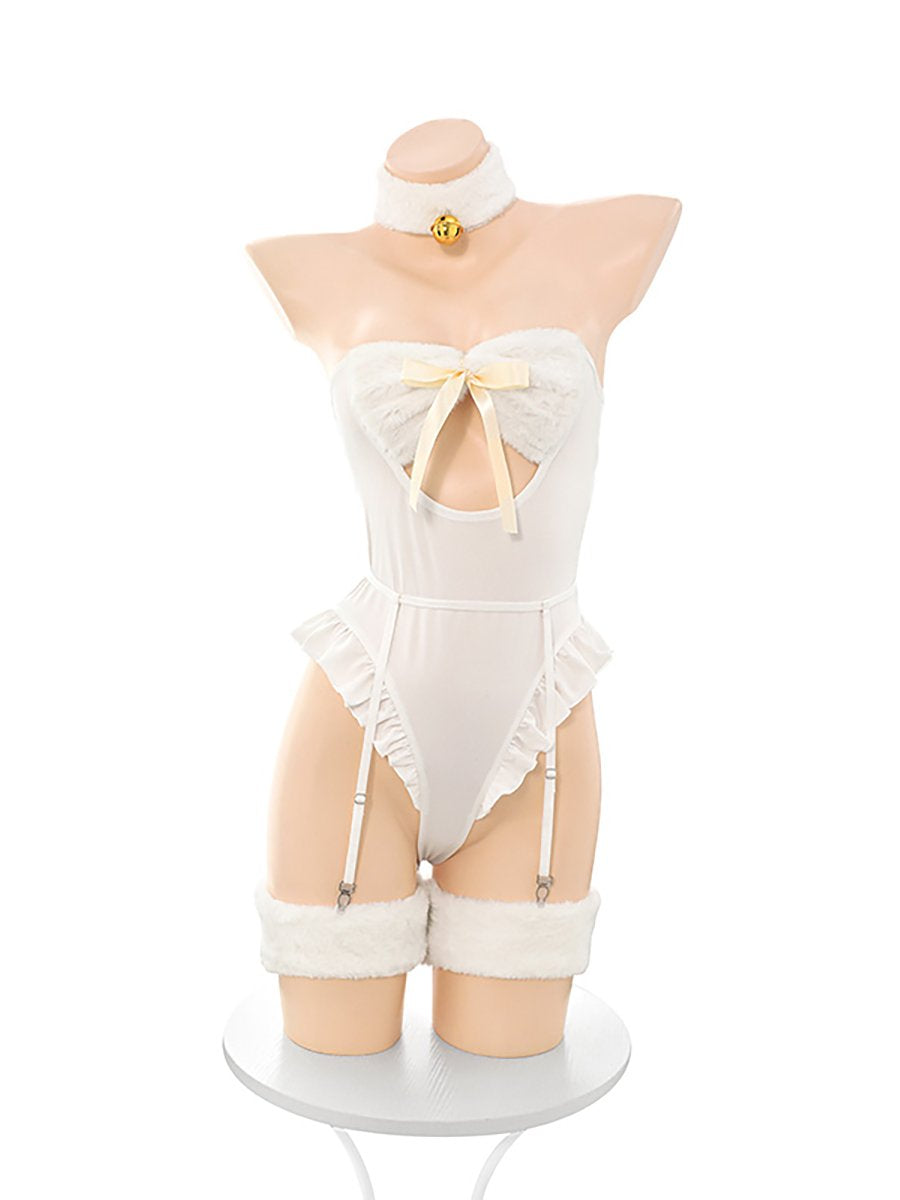 Design: Yomorio Open crotch teddy lingerie features strapless bodysuit, front a keyhole, an attached fuzzy white tail, an open crotch with hook and eye closure, and a high cut leg with ruffled trim, this costume creates an edgy yet playful look that will get all the attention.