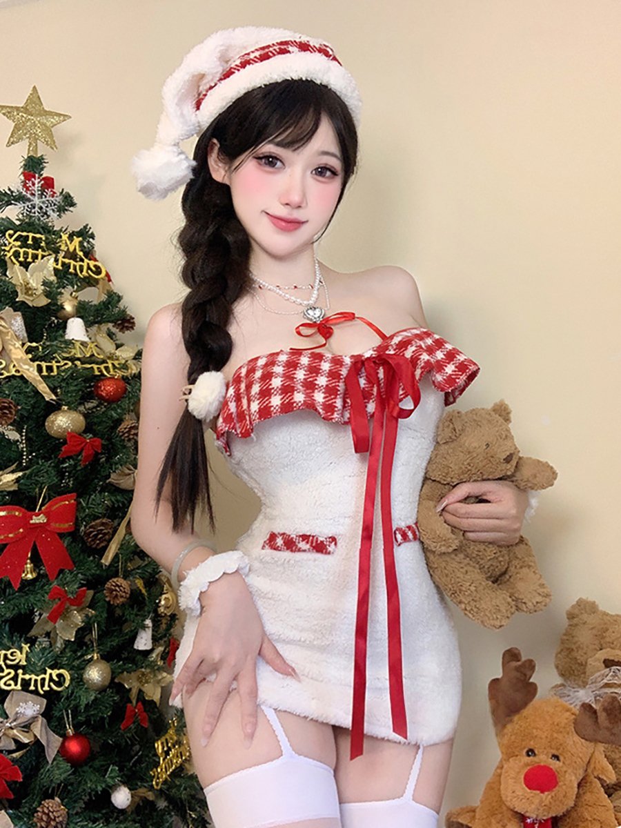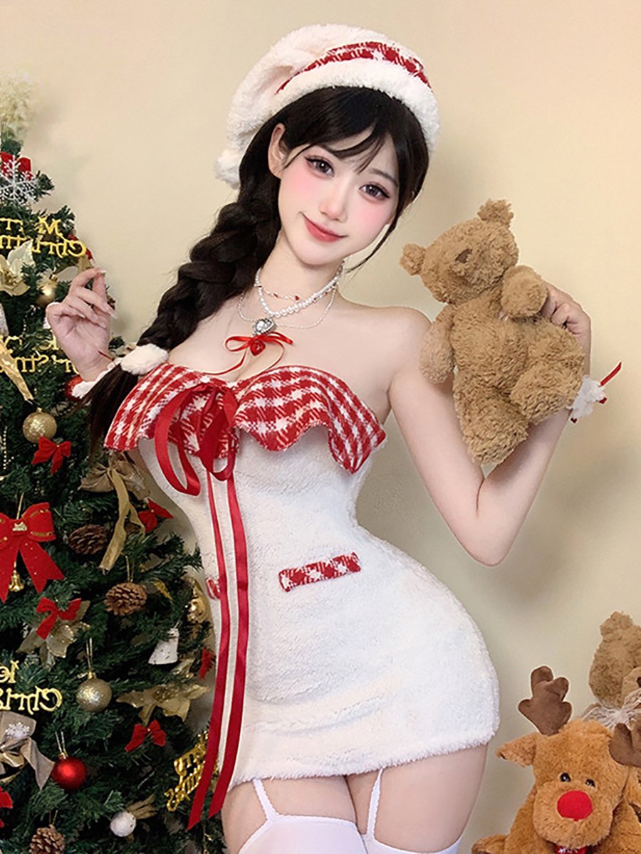 Design: This White Christmas Costume features a furry strapless mini dress, red plaid ruffled trim, and a matching white santa hat. This seductive look is crafted with superior quality materials and intricate details.
