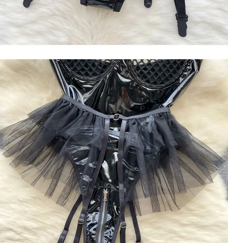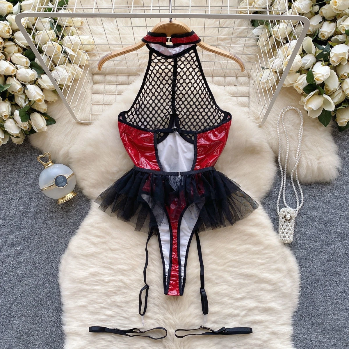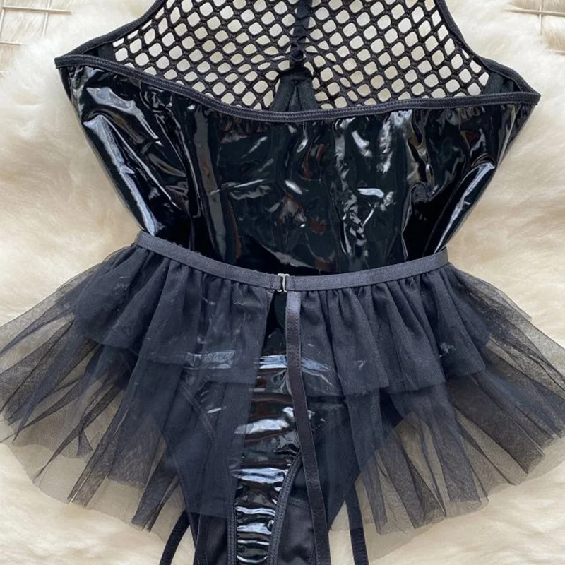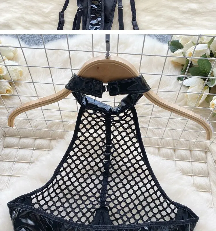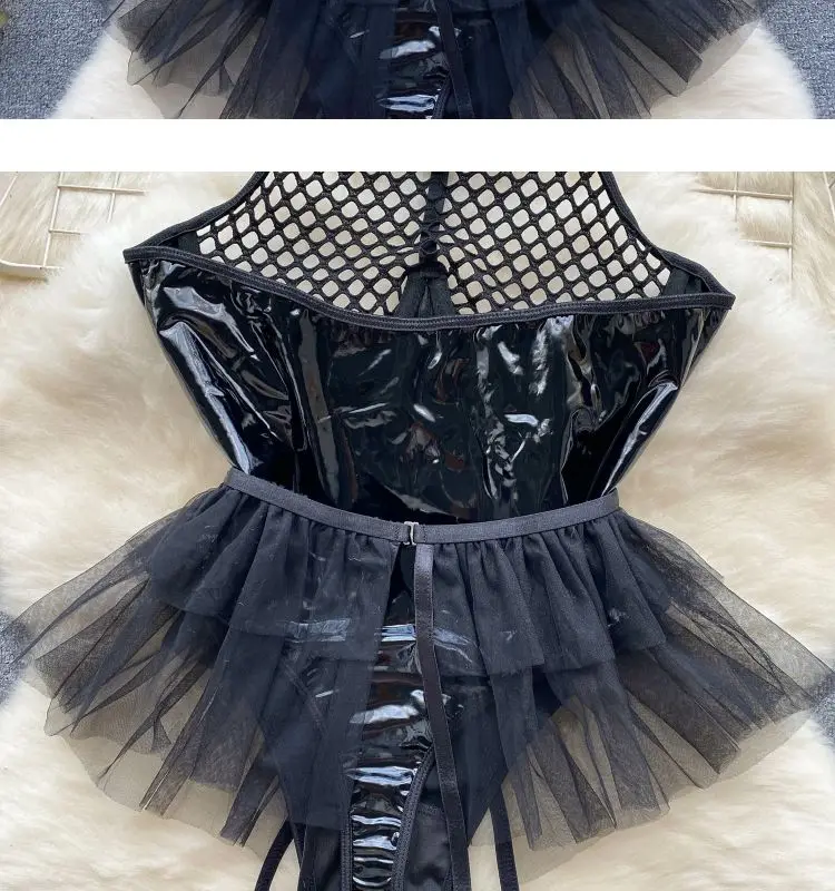 Women Sexy Halter PU Leather Patchwork Mesh Jumpsuit Bunny Girl Cosplay Uniform Lace Slim Hollow Out Bodysuit Short Skirt Pant S