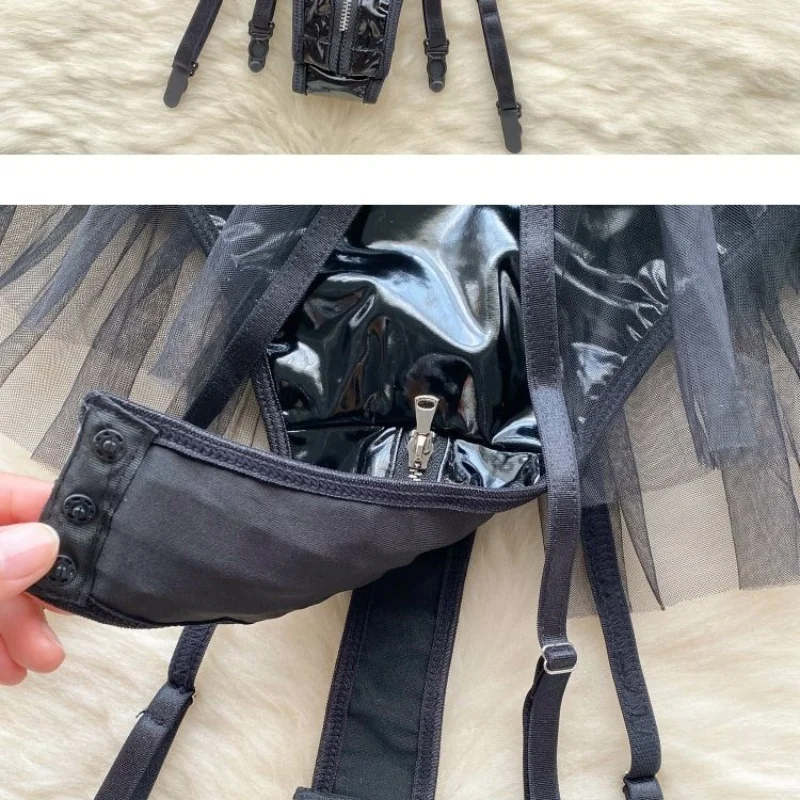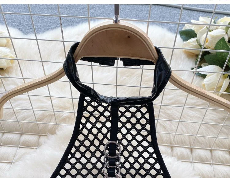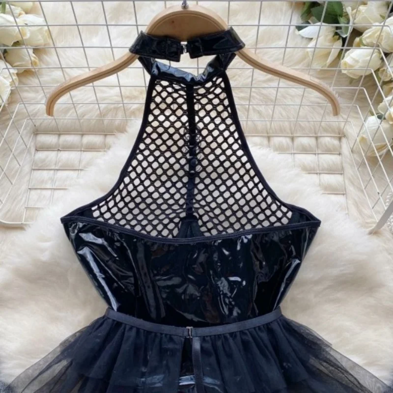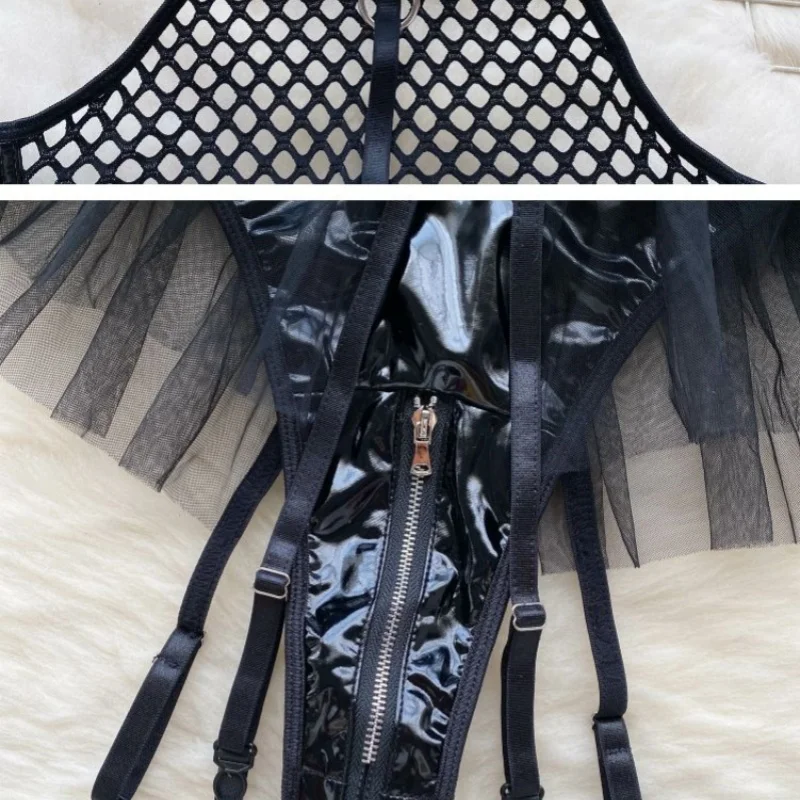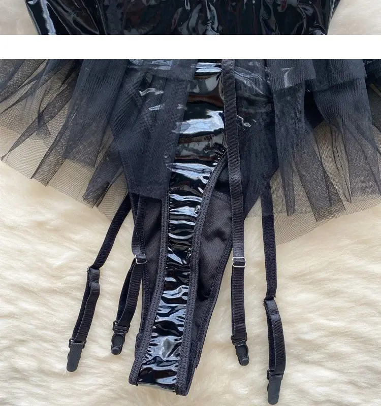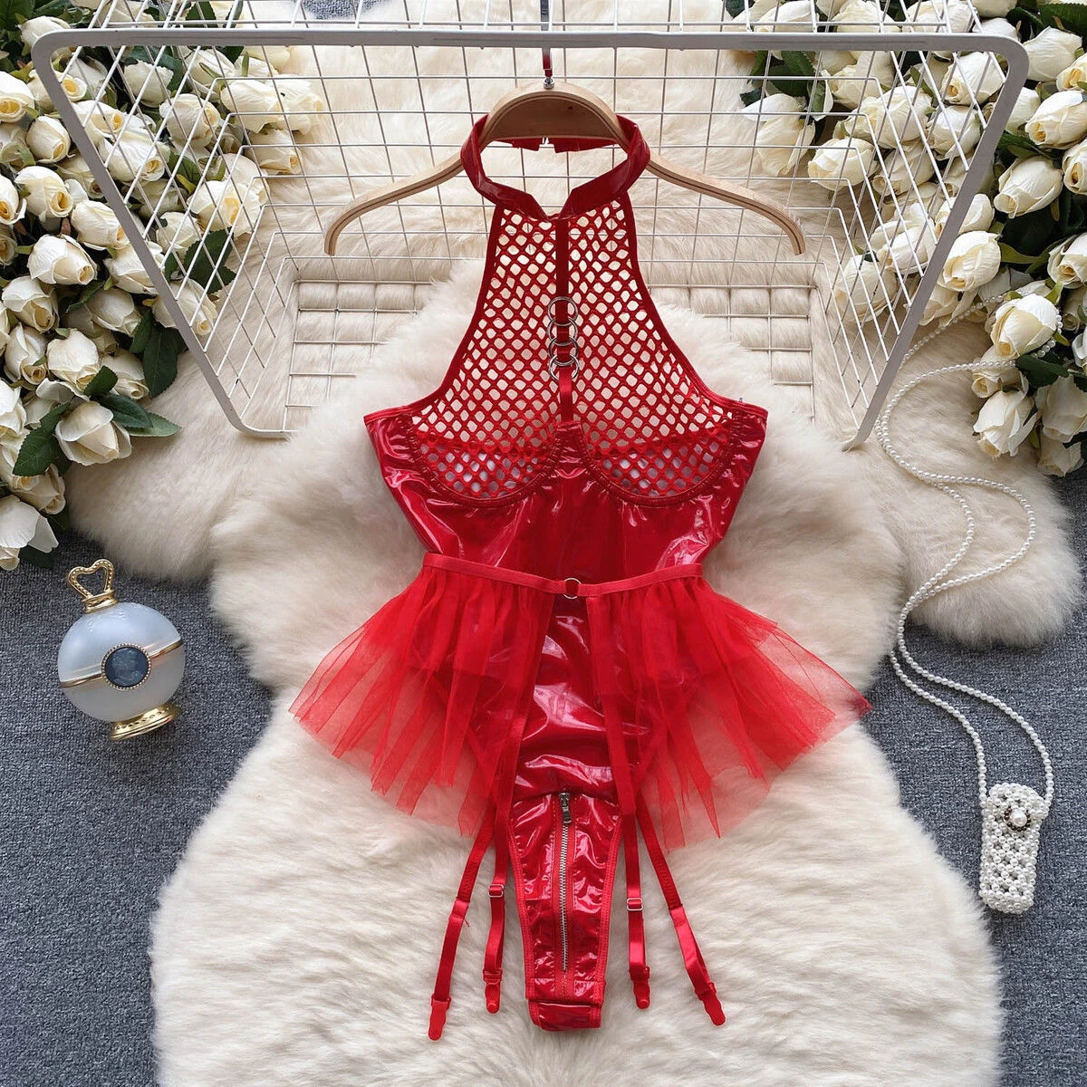 Women Sexy Halter PU Leather Patchwork Mesh Jumpsuit Bunny Girl Cosplay Uniform Lace Slim Hollow Out Bodysuit Short Skirt Pant S