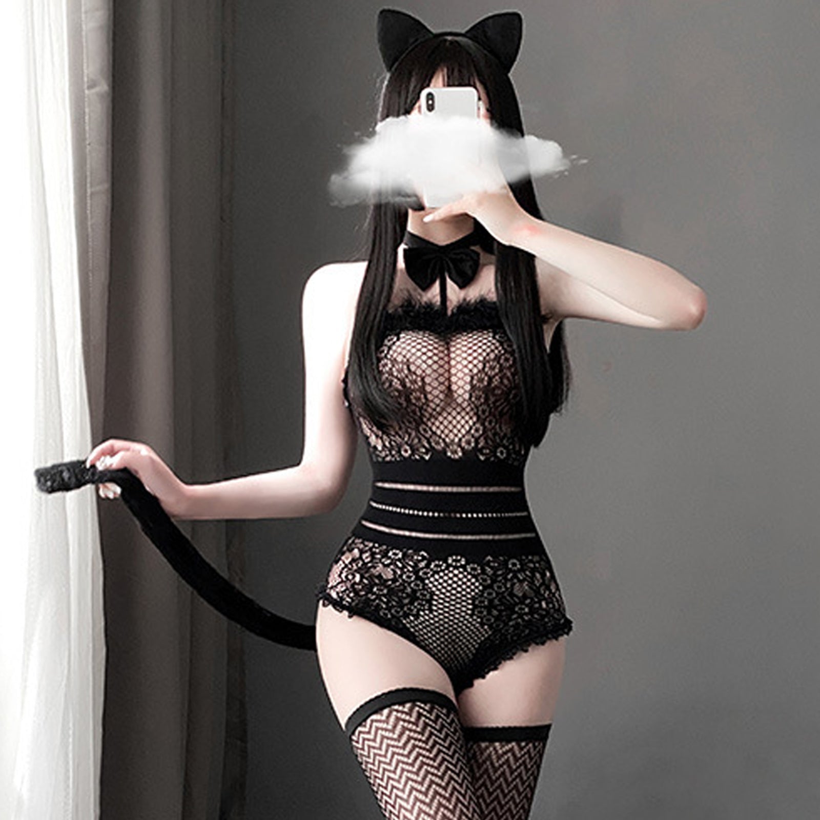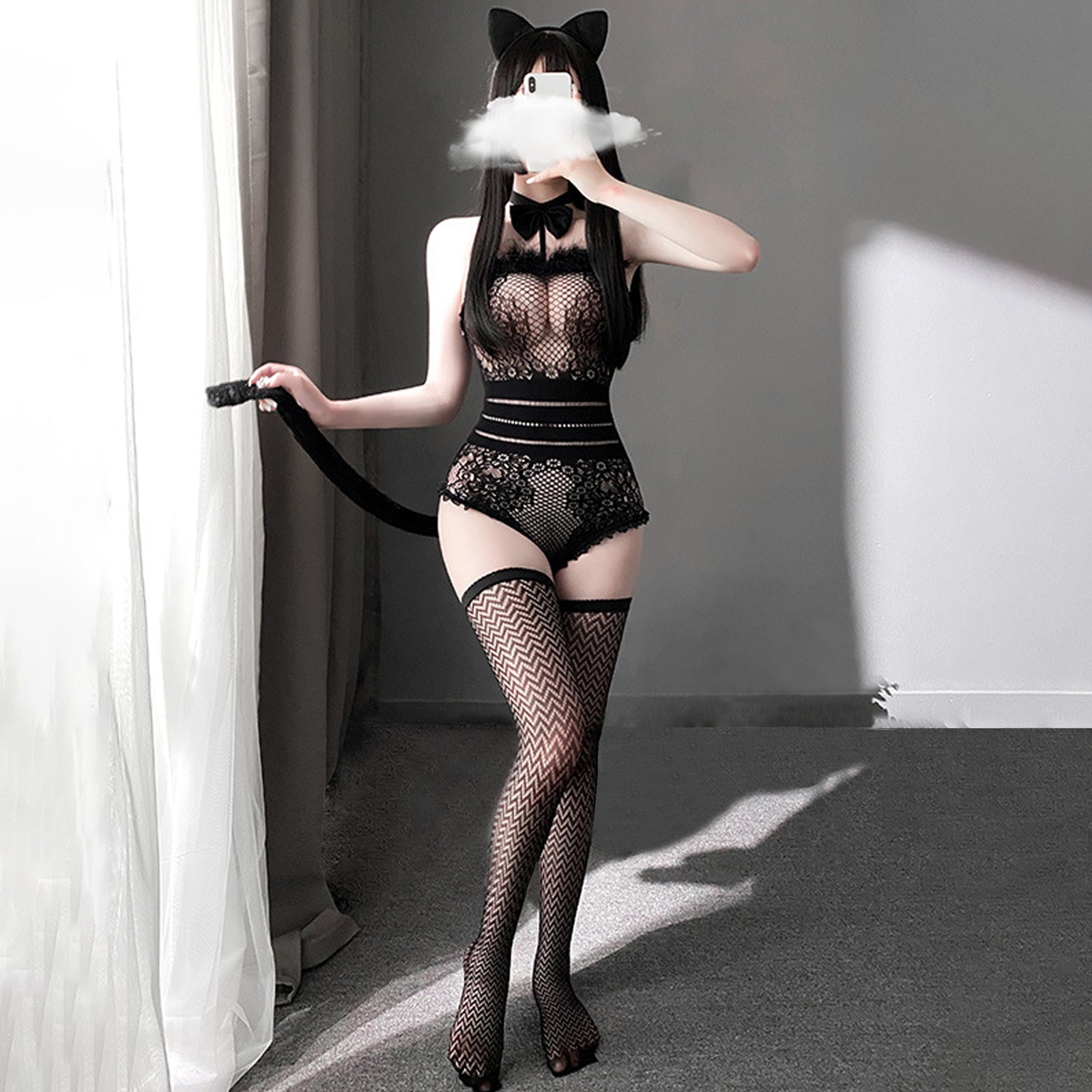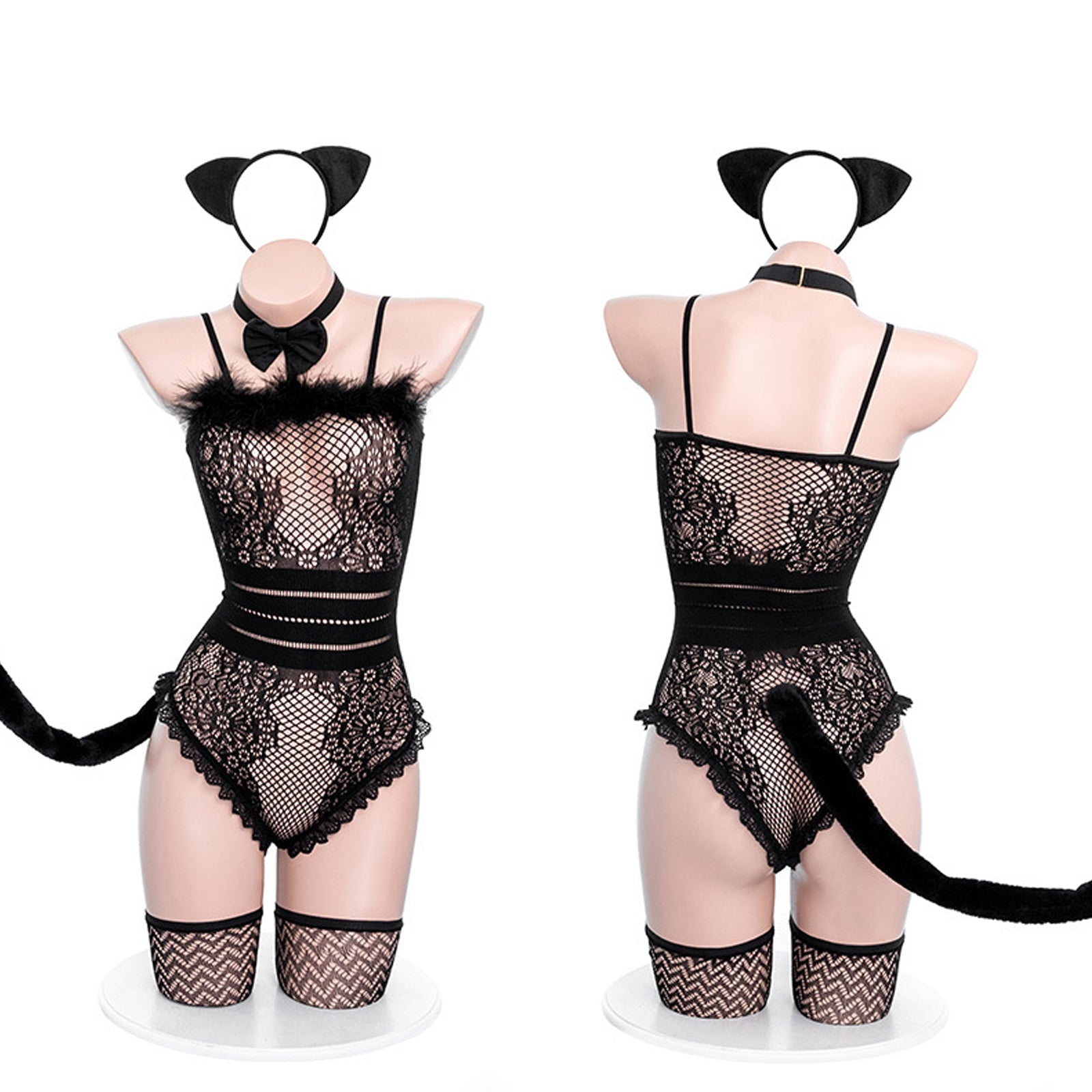 Yomorio Neko Girl Costume Anime Cat Cosplay Lingerie Black Fishnet Teddy Bodysuit