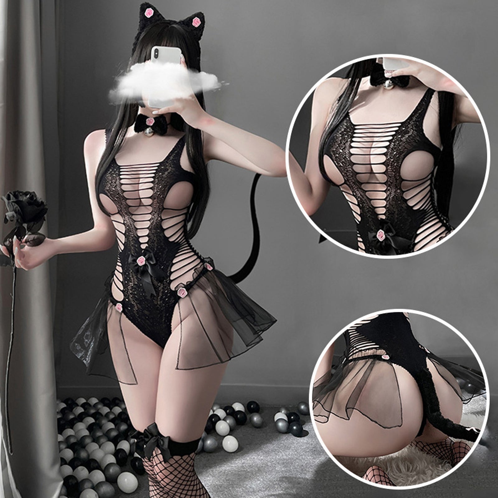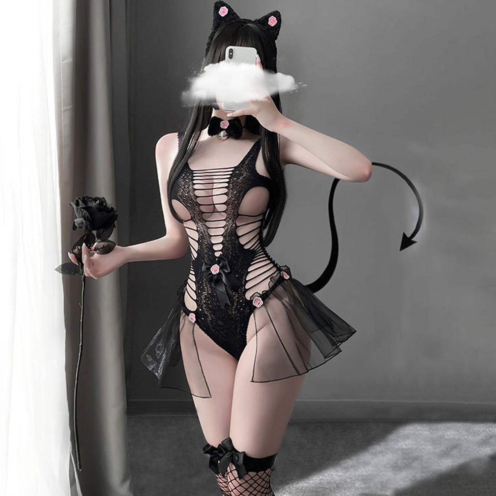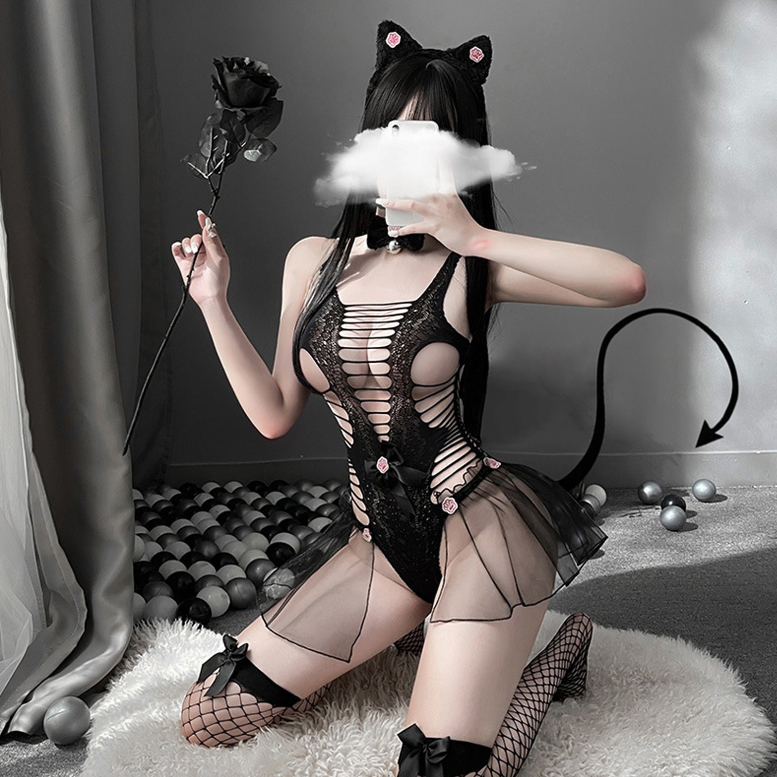 Yomorio Neko Girl Costume Cute Cat Cosplay Lingerie Set Black Hollow Out Teddy Bodysuit