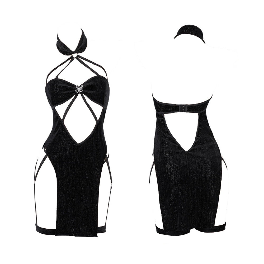 Design: This sexy black anime lingerie dress for women featuring a choker collar with O-ring accents, a strappy neckline, silver spider accents, a hook and eye back closure with a keyhole, an open bodice with straps detailing, a midi-length skirt with a sides slit, and attached wraparound leg garters.