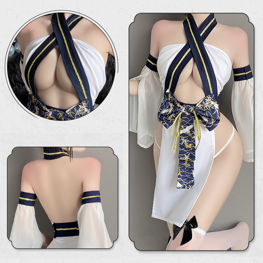 Design: Sexy anime lingerie featuring a criss-cross halter neckline with velcro closure, gold striped embroidery, open bust panel, sheer white draping fabric panels, a low open back, long mesh sleeves with slit openings, a big floral print bow at waist accents with velcro closure.